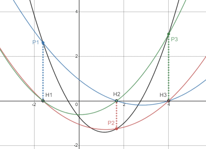 如图所示,将每一个点在 x 轴上的投影 (xi,yi) 记为 Hi 。对每一个 i ,我们选择一个点集 {Pi}∪{Hj∣1≤i≤n,i=j} ,作过这 n 个点的至多 n−1 次的线 gi(x) 。图中 f(x) 用黑线表示,gi(x) 用彩色线表示。